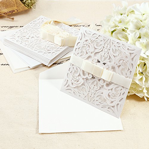 Set di 10 x bigliettini per partecipazioni di nozze, con decorazione in pizzo bianco e nastro con fiocco color crema, buste incluse, rif. modello # 754