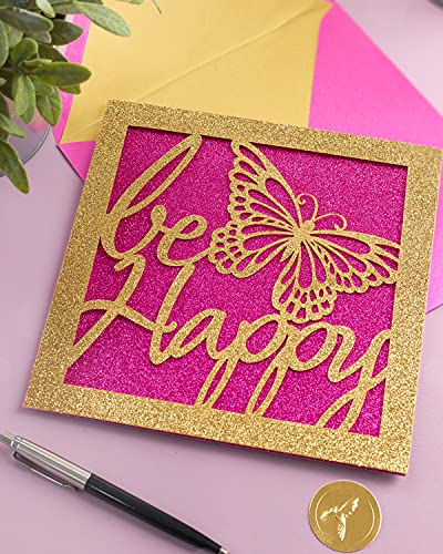 Invia loro un messaggio speciale con questo splendido biglietto, con una farfalla scintillante e una calligrafia 'be happy'.