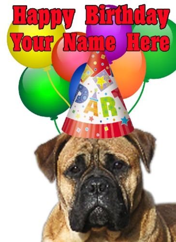 Biglietto di auguri di compleanno personalizzabile con cane di razza Bullmastiff, formato A5, con scritta in lingua inglese (lingua italiana non garantita)
