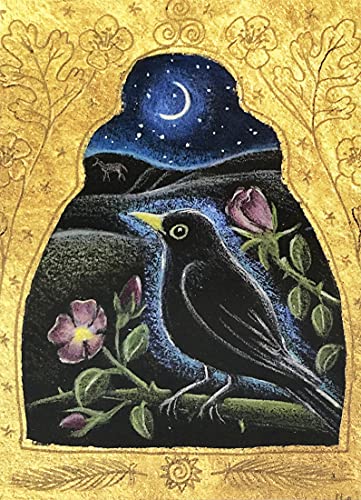 Biglietto di auguri con rose selvatiche di Hannah Willow. Summers Blackbird circondato da una cornice dorata di