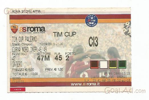 Biglietto Roma Palermo 12/04/2006 Stadio Olimpico TIM CUP Curva Nord risultato finale 1-0 Una piega al centro.