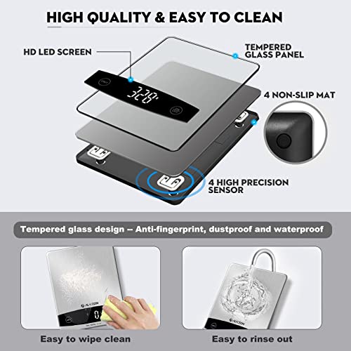 【Bilancia Digitale User-friendly】- La Bilancia da Cucina Digitale è dotata di Vetro Temperato rinforzato, anti-graffio, antipolvere e impermeabile, la superficie della bilancia elettronica è facile da pulire e mantenere. Il più grande display LED HD ti aiuta a leggere facilmente il valore anche in condizioni di scarsa luminosità.