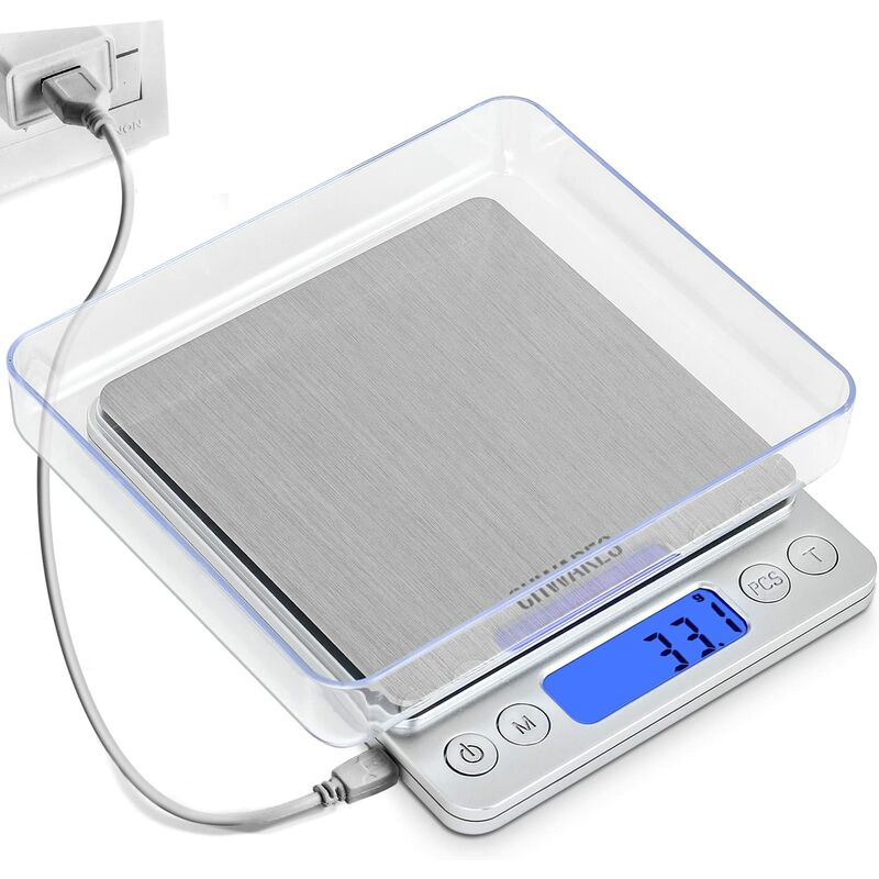 Ricarica USB con batteria al litio integrata. ALTA PRECISIONE: costruito con un sistema di sensori ad alta precisione, offre risultati immediati e precisi. Perfetto per misurare ingredienti, acqua, latte, lettere. Facile da pulire e da usare, è ideale per case, cucine. MULTIFUNZIONE: include la funzione di tara istantanea e automatica per una facile misurazione. Converti rapidamente e facilmente i risultati delle misurazioni in qualsiasi momento tra g, oz, lb, ml, kg, ml di latte con la semplice pressione di un solo pulsante. AMPIA GAMMA DI PESATURA: la bilancia da cucina digitale pesa tra 0,1 g e 3000 g, che si adatta a una varietà di articoli. DESIGN PORTATILE E DISPLAY RETROILLUMINATO: il design minimalista ed elegante rende elegante la bilancia elettronica per alimenti. Dotato di un display LCD ampio e chiaro con retroilluminazione bianca, puoi ottenere facilmente una lettura accurata. RISPARMIO ENERGETICO: ricarica USB, ricaricabile tramite USB. Dispone di indicazione di batteria