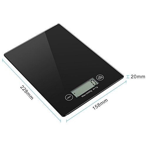 【Bilancia Cucina Moderna】La bilancia ha un design moderno ed elegante, con una superficie liscia di vetro temperato nero, con schermo LCD permette una maggiore leggibilità, occupa poco spazio può essere appesa alla barra in cucina.