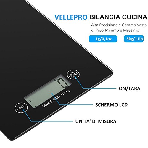 【Multifunzione】Vellepro bilancia cucina professionale fornisce indicazioni di batteria scarica e sovraccarico, auto-zero, autospegnimento, calcola la tara in automatico.