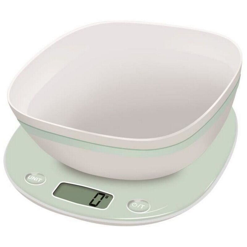 Bilancia elettronica da cucina Macaron Pistachio Bowl Terraillon 14670 con vasca integrata, facile da riporre. Tipo di prodotto: bilancia da cucina elettronica. Capacità: 5 kg. Graduazione: 1 g. Schermo a cristalli liquidi. Vassoio di plastica. Tara. Conversione liquida. Arresto automatico. Funziona con 2 batterie AAA non incluse. Dimensioni: 20,2 x 22,3 x 10,3 cm. Peso: 0,400 kg.