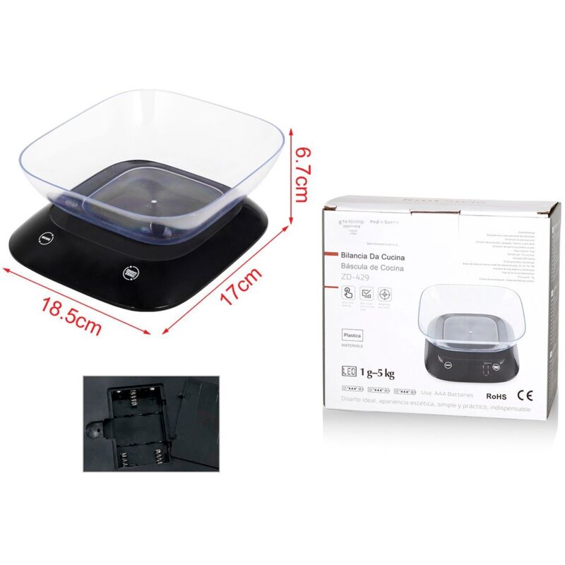 Mini bilancia digitale LED: Questa bilancia compatta è dotata di un display LED, offrendo una chiara visualizzazione dei pesi per la cucina. Portata versatile: Con una capacità massima di 5g e precisione a 1g, è ideale per pesare piccole quantità di ingredienti con precisione. Design pratico: Le dimensioni di L18.5xW17XH6.7cm la rendono perfetta per spazi ridotti in cucina, garantendo comodità e facilità di utilizzo. Alimentazione a batteria: Funziona con 3 batterie AAA (non incluse), garantendo un'utilizzazione senza fili e facilitando il posizionamento ovunque necessario. Completa di ciotola: La bilancia include una ciotola, rendendo più facile pesare e trasferire gli ingredienti durante la preparazione dei pasti. Mini bilancia digitale LED: Questa bilancia compatta è dotata di un display LED, offrendo una chiara visualizzazione dei pesi per la cucina. Portata versatile: Con una capacità massima di 5g e precisione a 1g, è ideale per pesare piccole quantità di ingredienti con