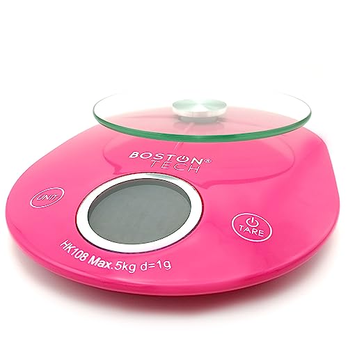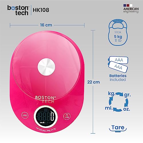 Colore rosa e design elegante, funzionale in qualsiasi cucina con un tocco di eleganza. Misura 18 x 14 x 1,5 cm. Grande per ciò di cui hai bisogno, ma perfetto per non rimuovere spazio nella tua cucina. E la funzione tara la rende perfetta per fare pasticceria o seguire ricette, resta automaticamente il peso di qualsiasi ciotola o contenitore. QUALITÀ TECNICA DI BOSTON La bilancia include una garanzia di due anni e viene fornita con le sue 2 batterie AAA, certificazioni CE e ROHS, due anni di garanzia..