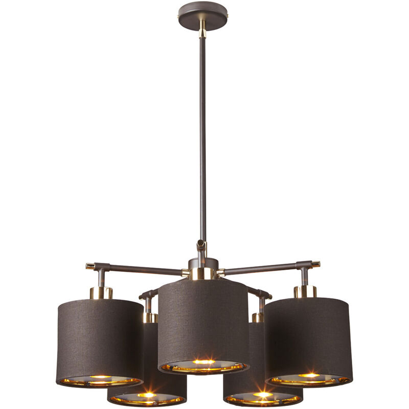 Collezione Balance STILE TRANSITIONAL Lampadario a 5 luci - Marrone e Ottone lucido. La finitura marrone moka contemporanea di Balance, abbinata agli elementi in ottone lucido, dona uno stile retrò a questa collezione, rendendola facilmente collocabile sia in ambienti moderni che in quelli più classici, in stile transitional. Ogni paralume ha una fodera metallica color oro. Le lampade a sospensione, da tavolo e da terra sono dotate di diffusori in tessuto, mentre i lampadari e le applique includono diffusori in acrilico. Tutti i componenti si prestano all'utlizzo di lampadine LED.