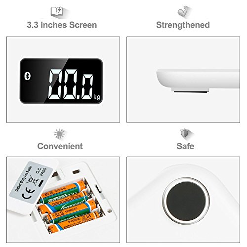 SENSORI AD ALTA PRECISIONE - La bilancia pesapersone pesa da 6,6 libbre / 3 kg a 396 libbre / 180 kg con un'approssimazione di 0,2 libbre / 0,1 kg. Si potrebbe percepire il piccolo cambiamento di peso corporeo sul grande display LCD da 3,3 pollici a casa, in bagno o in palestra con la piattaforma antiscivolo