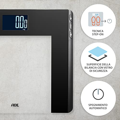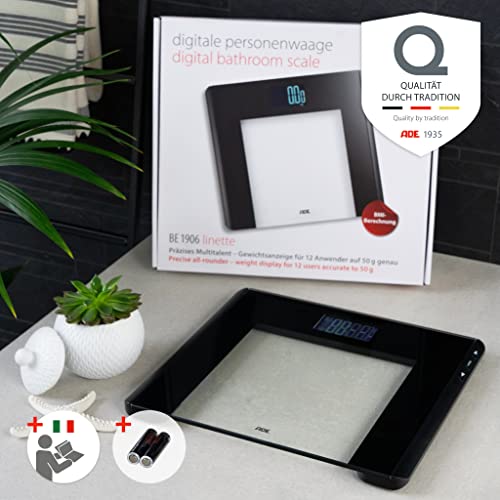ADE Bilancia pesapersone digitale con calcolo del IMC | pesata precisa con incrementi di 50 g | ampio display illuminato | 12 posizioni di memoria | fino a 180 kg | nero
