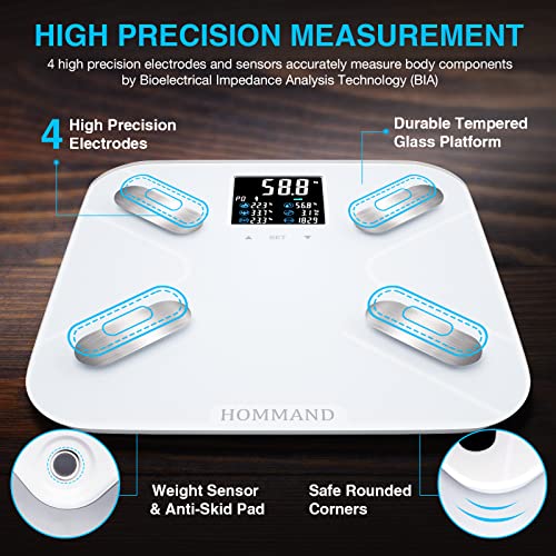 Bilancia Pesapersone Digitale, HOMMAND Bilancia Impedenziometrica bluetooth con Grande Display, Bilancia Pesapersone Professionale con APP per 16 Indici di Corporea, Massa Grassa Muscolare BMI