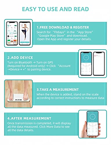 [Compatibilità] - Ideale per smartphone con Bluetooth. Supporta dispositivi iOS 7.0/Android 4.3 o successivi e Bluetooth 4.0. L'app gratuita "Fitdays" è facile da usare e può essere scaricata dall'App Store o da Google Play.