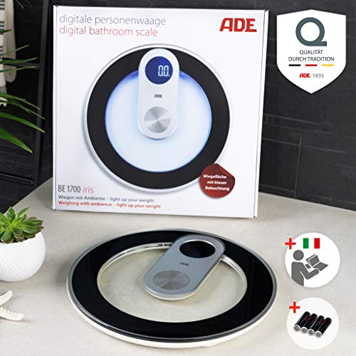 ADE Bilancia pesapersone digitale in vetro | risultati di alta precisione | elegante illuminazione a LED blu | display a LED | corpo rotondo senza angoli e spigoli | fino a 180 kg