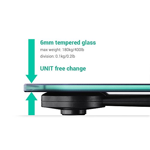 FACILE UTILIZZO - Larga, display digitale illuminato con numeri grandi che permettono una facile lettura a distanza o in qualsiasi condizioni di luce. Misura in modo accurato e preciso fino a 180 kg, con una sensibilità di 0.1kg o 0.2lbs. Rileva il peso in lb., kg e st. Funziona con 2 batterie AA (batterie INCLUSE)