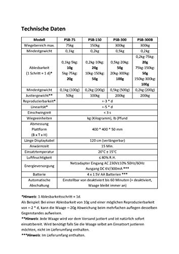 Dettagli: vedere la scheda tecnica come da immagine. La serie di bilancie PSB è composta da vari modelli con una gamma di misurazione tra 75 kg e 300 kg.