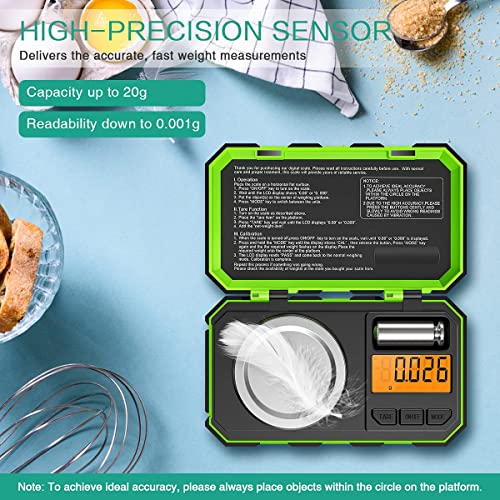 Bilancia Tascabile Digitale, ORIA Mini Bilancia 20g/0,001g con Peso di Calibrazione da 20g, Bilancia Multifunzionale con Tara e Display LCD Retroilluminato (Batteria/Pinzette Incluse) - Verde