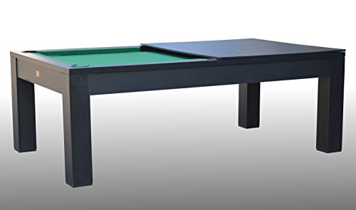 Accessori Forniti: Due stecche in legno, 15 biglie colorate più biglia bianca, triangolo, 2 gessetti, spazzola pulizia panno, piano trasformazione tavolo da pranzo.