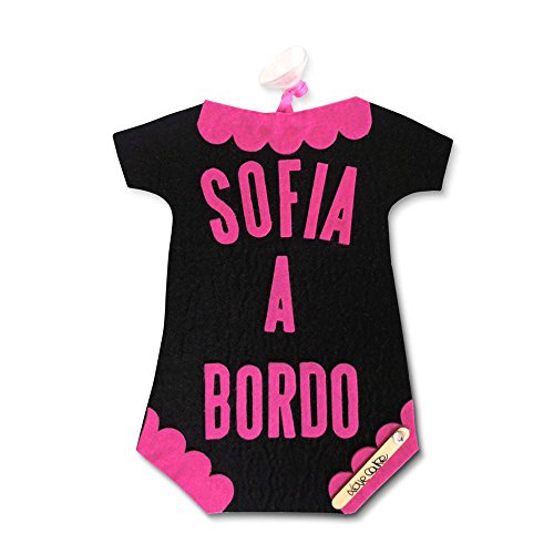 BIMBA A BORDO a forma di body by LOVECAKE, PERSONALIZZABILE con nome del bebé. VENTOSA INCLUSA! (nero-fucsia COD1494)