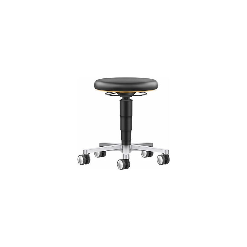 Sgabello da laboratorio, con rotelle, molla a gas con regolazione dall'anello, anello arancione. Fornitura = in parte smontato. Materiale sedile = similpelle. Versione telaio = con rotelle. Materiale telaio = alluminio. Tipo di regolazione dell'altezza = pompa a gas con anello. Colore sedile = nero, arancione. Altezza sedile = 450-650 mm. Diametro sedile = 400 mm. Portata = 120 kg. Diametro del piede = 540 mm. Diametro rotelle = 65 mm. Versione rotelle = rotelle morbide per superfici dure. Tipo di prodotto = sgabelli da lavoro, sgabelli da lavoro da laboratorio. Altezza regolabile in modo continuo con molla a gas tramite pratico anello di azionamento. Anello colorato per imbottire e proteggere i bordi, resistente nel tempo. Salvaspazio grazie al basamento a razze sagomato e compatto con Ø 540 mm. Senza giunture: igienici, facili da pulire e disinfettare. Lavabili e resistenti ai disinfettanti, morbidi e confortevoli. Rotelle morbide doppie per pavimenti duri. Lo sgabello è una