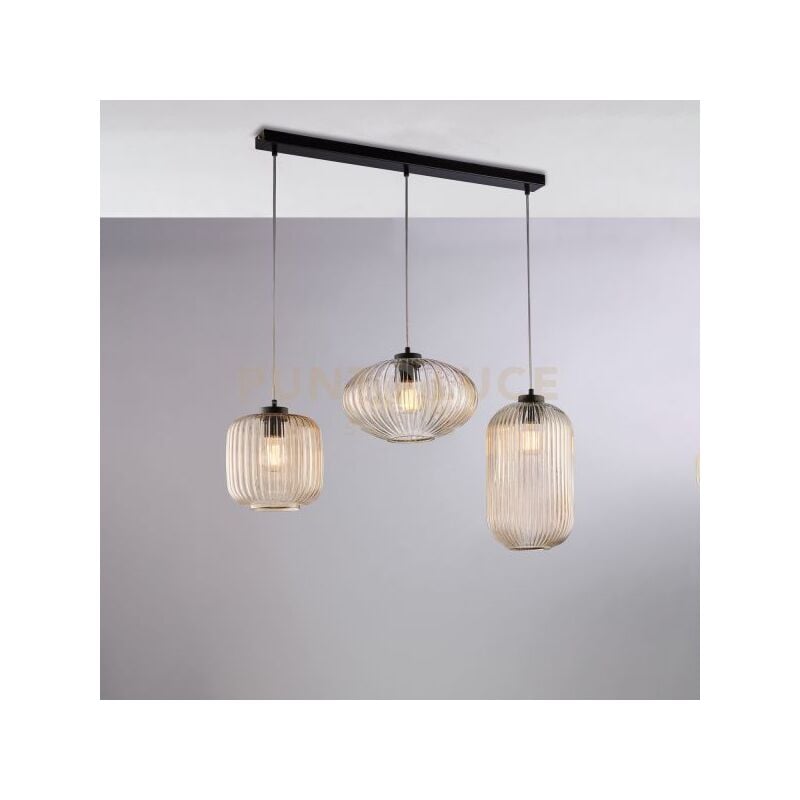 Binario in ferro laccato nero con cavi elettrici regolabili e diffusori in vetro soffiato ambra con decoro rigatura in rilievo 3 luci