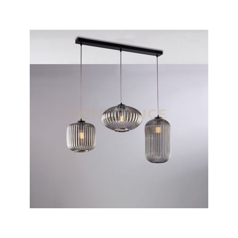 Binario in ferro laccato nero con cavi elettrici regolabili e diffusori in vetro soffiato grigio specchiato con decoro rigatura in rilievo 3 luci