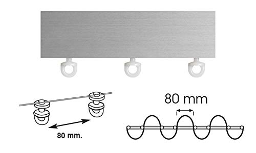 LA CONFEZIONE CONTIENE: BINARIO IN ALLUMINIO - TAPPI TERMINALI DA 8 MM - OCCHIELLI IN PVC OGNI 8 CM - STAFFE A PARETE DA 9 CM - TASSELLI + VITI - BRUGOLA PER FISSAGGIO VITE