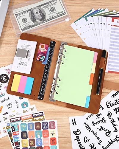 Binder in Pelle,42 Pcs Raccoglitore ad 6 Anelli,Buste Trasparenti Cerniera Fogli di Budget Etichette Adesive Righello Divisori per Raccoglitori Cartella Delle Ricevute Adesivi di Categoria (Marrone)