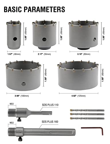 BINOTA Fresa a Tazza Carotatrice Set 40 65 80 100 125 mm con Codolo SDS Plus 110 mm e SDS MAX 160 mm per Cemento, Mattoni, Pietra, Muro