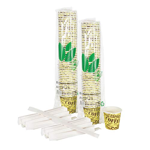 Bioaiks 100 Bicchierini Caffe in Carta e Palettine in Legno - Biodegradabili e Compostabili - 75 ml (Giallo)