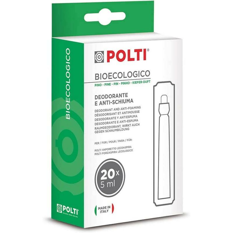 Ricambio Originale Polti Deodorante che previene la formazione di schiuma nel filtro ad acqua di Lecologico e Lecoaspira Contenuto: 20 fialette da 5 ml Aiuta a prevenire la formazione di cattivi odori all?interno del secchio di raccolta Composizione: eugenol, citral, cinnamal Hai dubbi sulla compatibilita?Contattaci un nostro esperto sara' lieto di aiutarla Spedizione in tutta Italia in sole 24/48 ore lavorative. Per qualunque informazione non esiti a contattarci
