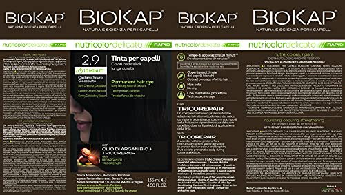 BIOKAP Nutricolor Delicato Rapid, Tinta capelli senza ammoniaca che rende i capelli morbidi, Colorazione capelli con 10 minuti di posa, 135 ml (2.9 Castano Scuro Cioccolato)