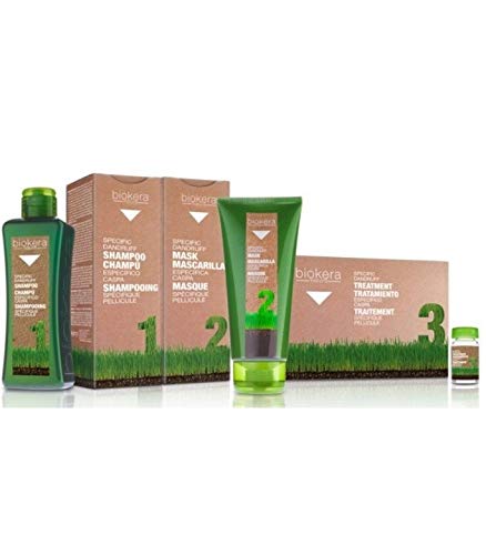 Pack composto da shampoo specifico per caspa biokera natura, maschera specifica per caspa biokera natura e trattamento intensivo in fiale caspa biokera natura.