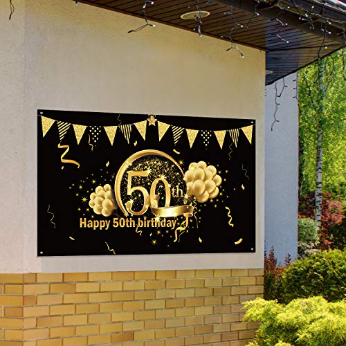 50th Birthday Party Decoration, Extra Large Fabric Sign Poster for 50th Anniversary Photo Booth Backdrop Background Banner, 50th Birthday Party Supplies (Oro Nero)