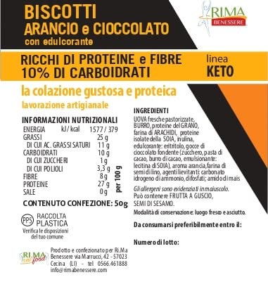 Keto biscotti arancia e cioccolato: solo 1g di Carboidrati. Ideali per la Dieta Chetogenica. Senza zuccheri aggiunti. Ricco di proteine e fibre. Vegani. Confezione da 50g.