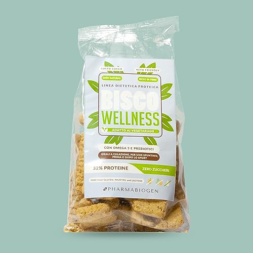 Biscotti proteici Low Carb “Bisco Wellness” con omega3 e prebiotici gusto Cocco. Vegano. Formato da 200g.