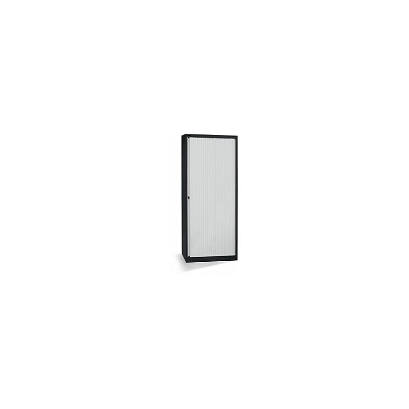 Armadio a serranda Euro, larghezza 800 mm, 4 ripiani, nero notte / grigio chiaro. Fornitura = montato. Altezza = 1980 mm. Larghezza = 800 mm. Profondità = 430 mm. Colore corpo = nero notte. Materiale corpo = lamiera d'acciaio, verniciata a polvere. Colore serranda = grigio chiaro. Caratteristiche = con serratura. Serratura = serratura a cilindro con 2 chiavi. Numero file raccoglitori = 5 pz. Materiale serranda = plastica. Dotazione interna = 4 ripiani. Numero ripiani = 4 pz. Portata per ripiano = 45 kg. Colore ripiani = nero notte. Tipo di porta = serranda orizzontale. Passo di regolazione altezza ripiani = 25 mm. Larghezza interna = 646 mm. Altezza interna = 1850 mm. Profondità interna = 395 mm. Spessore ripiani = 23 mm. Spessore del corpo = 0.8 mm. Completi di ripiani in acciaio. Con serratura. Le serrande scompaiono completamente nel corpo. Maniglia a listello nel colore della serranda. Corpo in lamiera d'acciaio spessore 0,8 mm con verniciatura a polvere strutturata e piedini ad