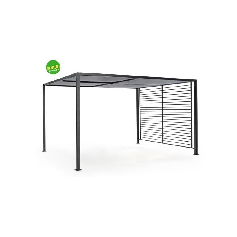 Gazebo in stile moderno modello Noah, realizzato con struttura in alluminio verniciato a polvere colore grigio scuro. I pali misurano 65x65mm, tettuccio superiore scorrevole in textilene grigio scuro. Prodotto da assemblare. Le dimensioni sono di 300 cm di lunghezza per 360 cm di profondità;