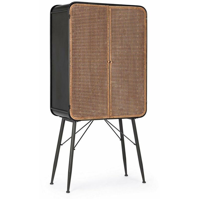 Il mobile 2 ante da bar “Elton” è un prodotto di design che unisce la robustezza dell'acciaio alla calda eleganza del legno. Il mobile ha una struttura in acciaio verniciato di nero, con due ante scorrevoli che si aprono su uno spazio interno suddiviso da una mensola. I cassetti sono in legno di rovere, con maniglie in metallo e guide telescopiche. Il mobile è ideale per arredare un angolo bar in casa o in ufficio, offrendo praticità e stile. Dettagli Struttura in acciaio verniciata a polvere epossidica. Cassetti in legno di abete con finitura a cera. Ante in acciaio con lavorazione effetto rattan. Vano interno con portabottiglie e porta bicchieri in acciaio. Gambe da assemblare. Dimensioni Lunghezza: 80 cm Larghezza: 39 cm Altezza: 161 cm