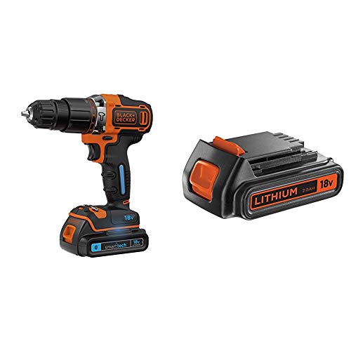 BLACK+DECKER BDCHD18KST-QW Trapano Avvitatore a Percussione, 18 V, al Litio, 1.5 Ah, Tecnologia Smart Tech, Arancione/Nero + BL2018-XJ Batteria al Litio, 18 V, 2.0 Ah