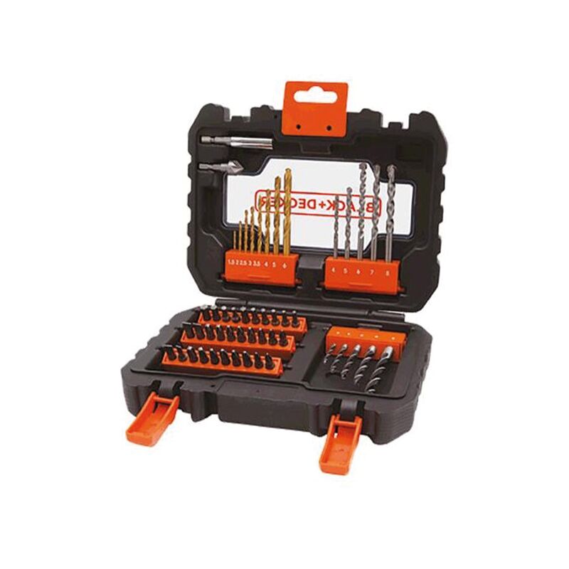 Black & Decker set 50 pezzi per forare ed avvitare Set 50 pezzi per forare ed avvitare composto da: 5 punte per legno (3-8mm) 8 punte metallo (1.5-6mm) 5 punte per muratura (4-8mm) 30 inserti da 25mm (PH, SL, PZ, TX, Hex) 1 adattatore magnetico per inserti da 25mm1 svasatore