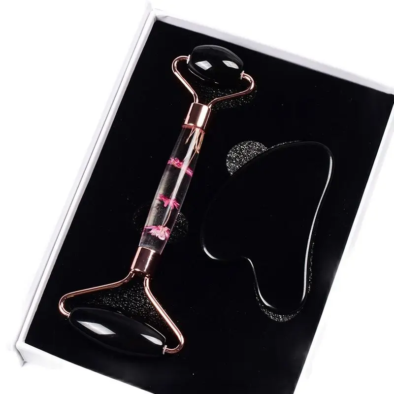 Black Obsidian Face Care Massage Roller Gua Sha Tool Set Natural Crystal Mineral Stone Health Skin Acupuncture Beauty Massager