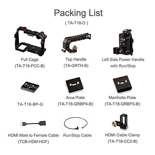Include: Full Camera Cage per Sony a7S III, maniglia superiore a sgancio rapido, piastre base a sgancio rapido Arca e Manfrotto, un adattatore HDMI maschio a HDMI femmina, un morsetto per collegare comodamente l'adattatore HDMI alla gabbia e infine un Left Side Advanced Power Handle con Run / Stop che può essere fissato al lato della gabbia.