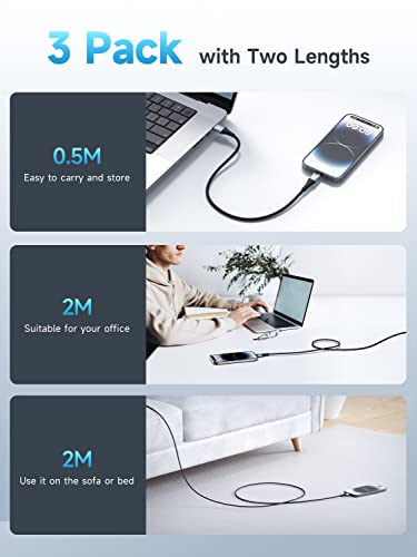 [Confezione da 3 Cavo Ricarica iPhone da 0.5M+2M+2M] Filo di rame più spesso per una ricarica più stabile e veloce: supporta la ricarica rapida fino a 2,4 A, il 75% più veloce rispetto ai cavi standard. Con il cavo per iPhone da potrai ricaricare i tuoi dispositivi in camera, ufficio o anche dal sedile posteriore dell'auto.