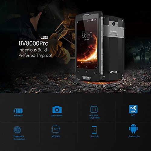 Blackview BV8000 Pro Smartphone,5.0 Pollici Display Android 7.0 4G Telefono Cellulare,IP68 Waterproof /Dustproof /Shockproof Moible Phone,MTK6757 Octa-core 2.6GHz,6GB RAM + 64GB ROM,16.0MP+8.0MP Dual Camera,Dual Sim 4180mAh Batteria,Gesture Wakeup,WiFi/Hotkont/GPS/OTG/ OTA/NFC Cellulare - Argento