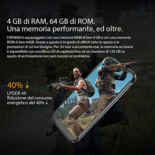 ★【Nuovo Android 9.0, Processore Cortex A73, NeuroPilot Intelligence. Un passo avanti verso il futuro】Grazie al nuovo processore octa-core Helio P70, il BV9600 è in grado di gestire senza compromessi il multitasking più impegnativo. L'intelligienza artificiale implementata a livello hardware è in grado di gestire sempre al meglio CPU, GPU e APU. Avrai sempre tutta la potenza necessaria a tutte le attività più intense, come giocare e postare sui social network.