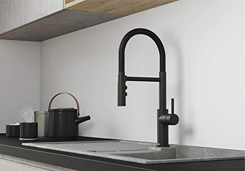 Per accentuare il design moderno: rubinetto da cucina con verniciatura a polvere di alta qualità in nero opaco, con beccuccio a forma di arco e tubo flessibile in gomma