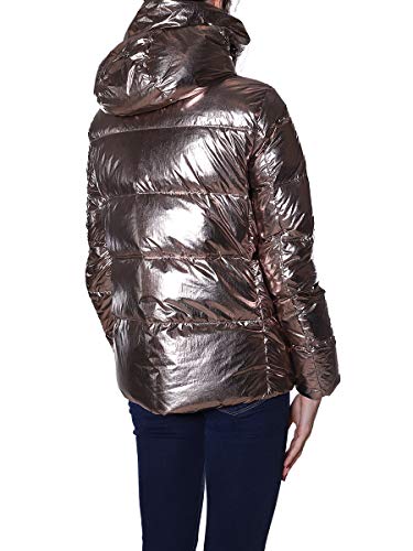 Piumino in nylon lucido effetto metallizzato con cappuccio e collo alto.Svasato sul fondo e imbottito con trapuntatura a linee orizzontali.