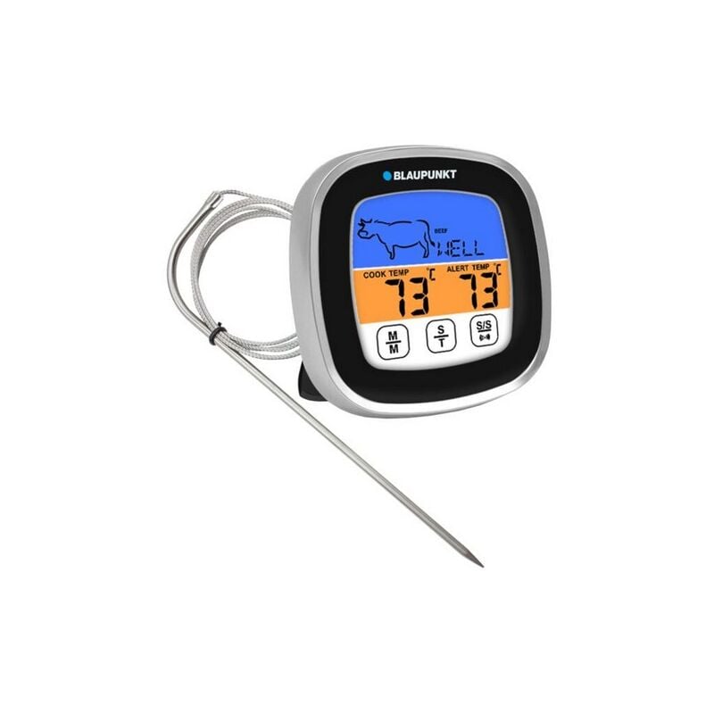 Dati tecnici: Funzione termometro per carne (-20 - 300?) Selezione di 8 tipi di carne: manzo, montone, agnello, prosciutto, maiale, tacchino, pollo, pesce Selezione di 5 gradi di cottura: molto al sangue, mediamente al sangue, mediamente al sangue, raro e ben fatto Sonda di temperatura in acciaio (lunghezza 165 mm, diametro 2,5 mm) Sensore di temperatura su cavo lungo 1 m Facile controllo del dispositivo grazie al display touch Magnete da frigorifero per una facile conservazione Alimentazione: 2 batterie AAA (LR03), non incluso Dimensioni: 7,5 x 7,5 x 2,5 cm Peso: 0,09 kg Un arrosto ben cotto, una bistecca perfettamente fritta, un succoso collo di maiale o una soffice cheesecake senza macchie a volte sono una vera sfida per il cuoco di questi piatti. Il termometro digitale Blaupunkt FTM501 è utile quando si prepara carne succosa. Questo modello misura temperature che vanno da -20 a 300°C. La funzione termometro per carne consente di selezionare uno degli otto tipi di carne e