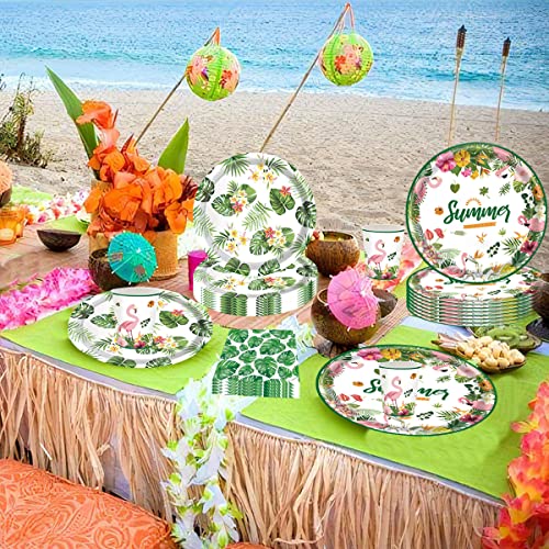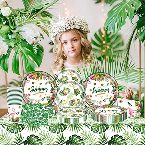 BlinBlin Set di Stoviglie per Feste Hawaiane, Forniture per Stoviglie per Feste Fenicotteri, Set di Posate per Feste in Foglia di Palma Estiva, Piatti Tazze Tovaglioli Tovaglia, Servire 16 Ospiti